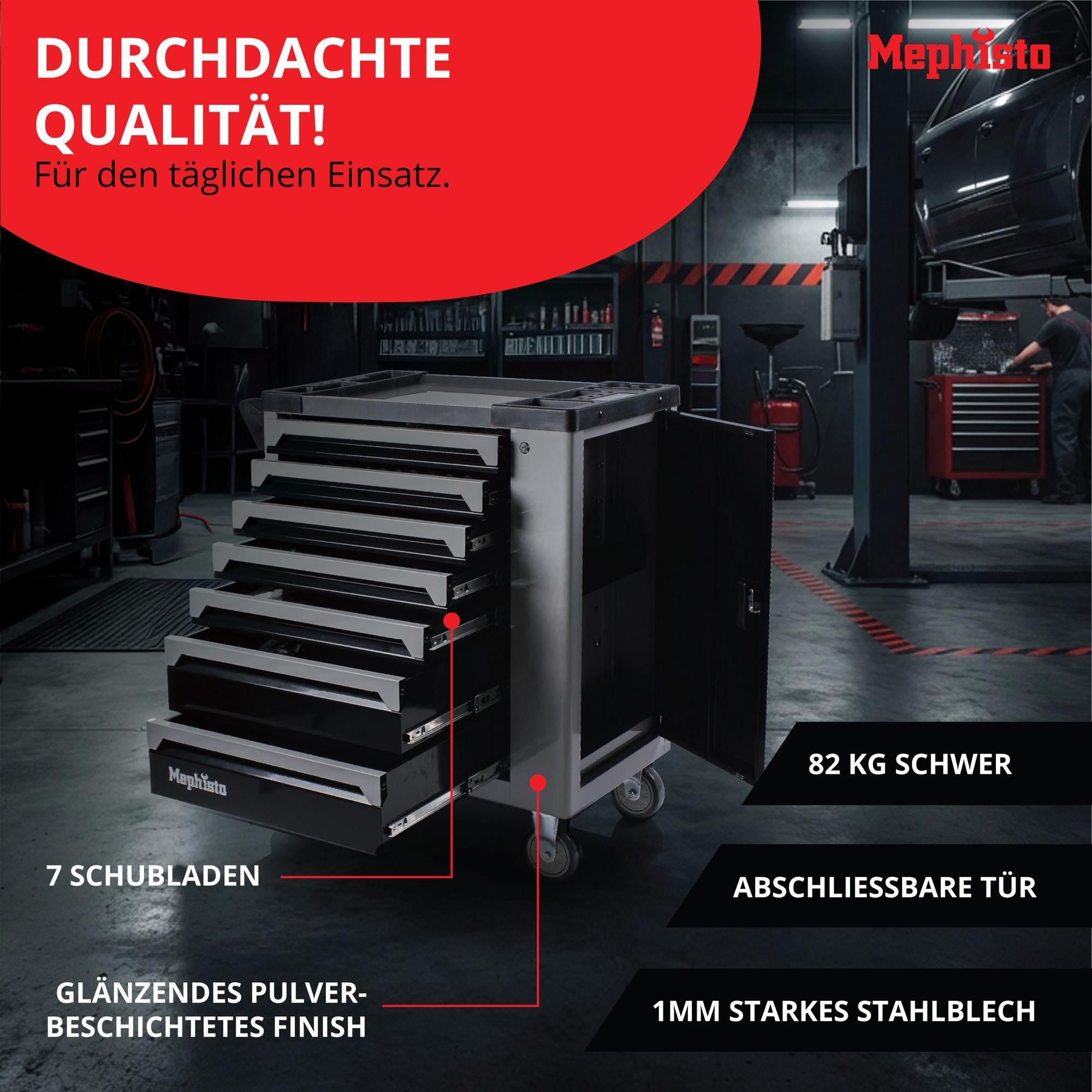 Premium XXL-Werkzeugwagen von Mephisto-Tools 7/7 Schubladen mit Werkzeug (beste Ausstattung zum besten Preis) inklusive zusätzlicher Einlage mit Werkzeug