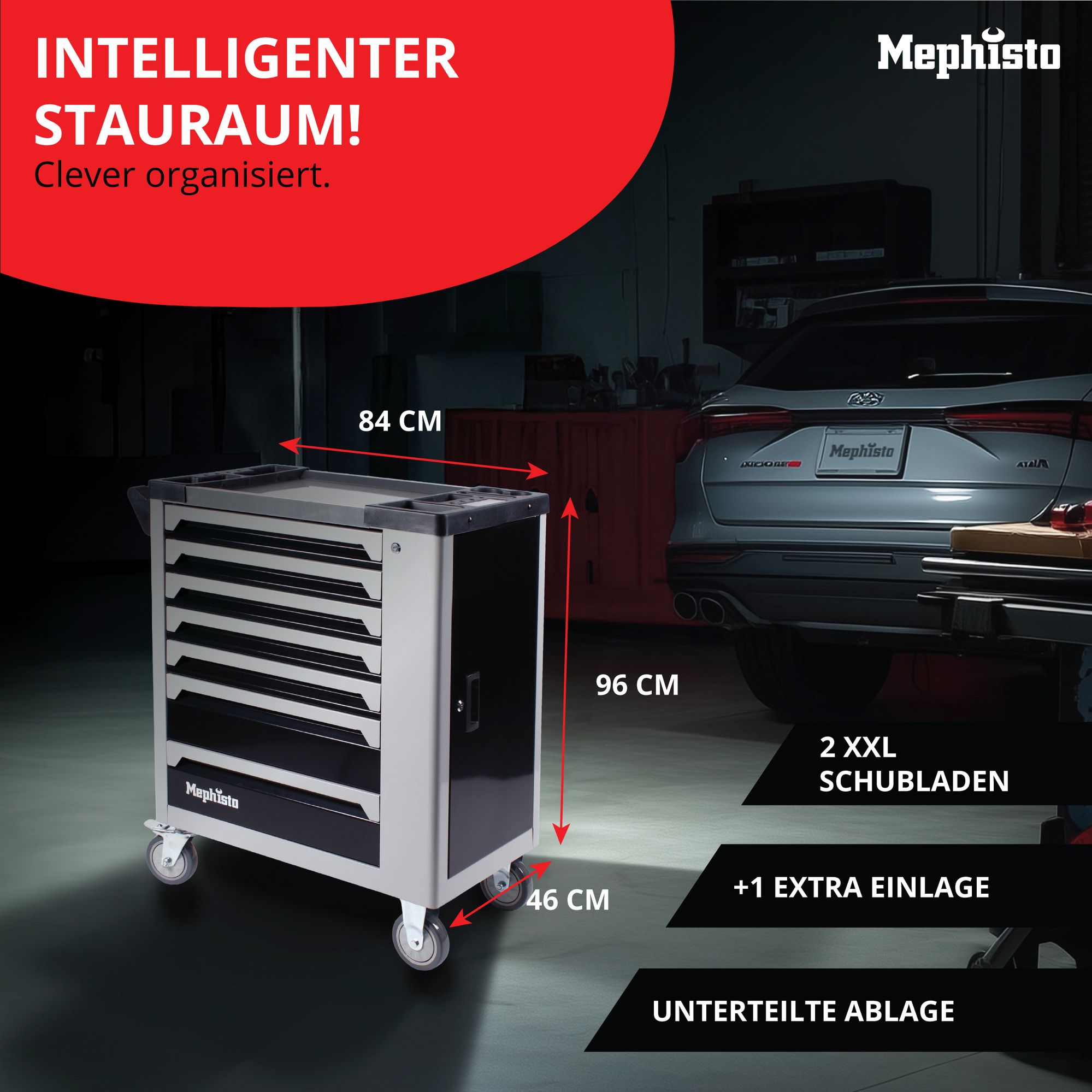 Premium XXL-Werkzeugwagen von Mephisto-Tools 7/7 Schubladen mit Werkzeug (beste Ausstattung zum besten Preis) inklusive zusätzlicher Einlage mit Werkzeug