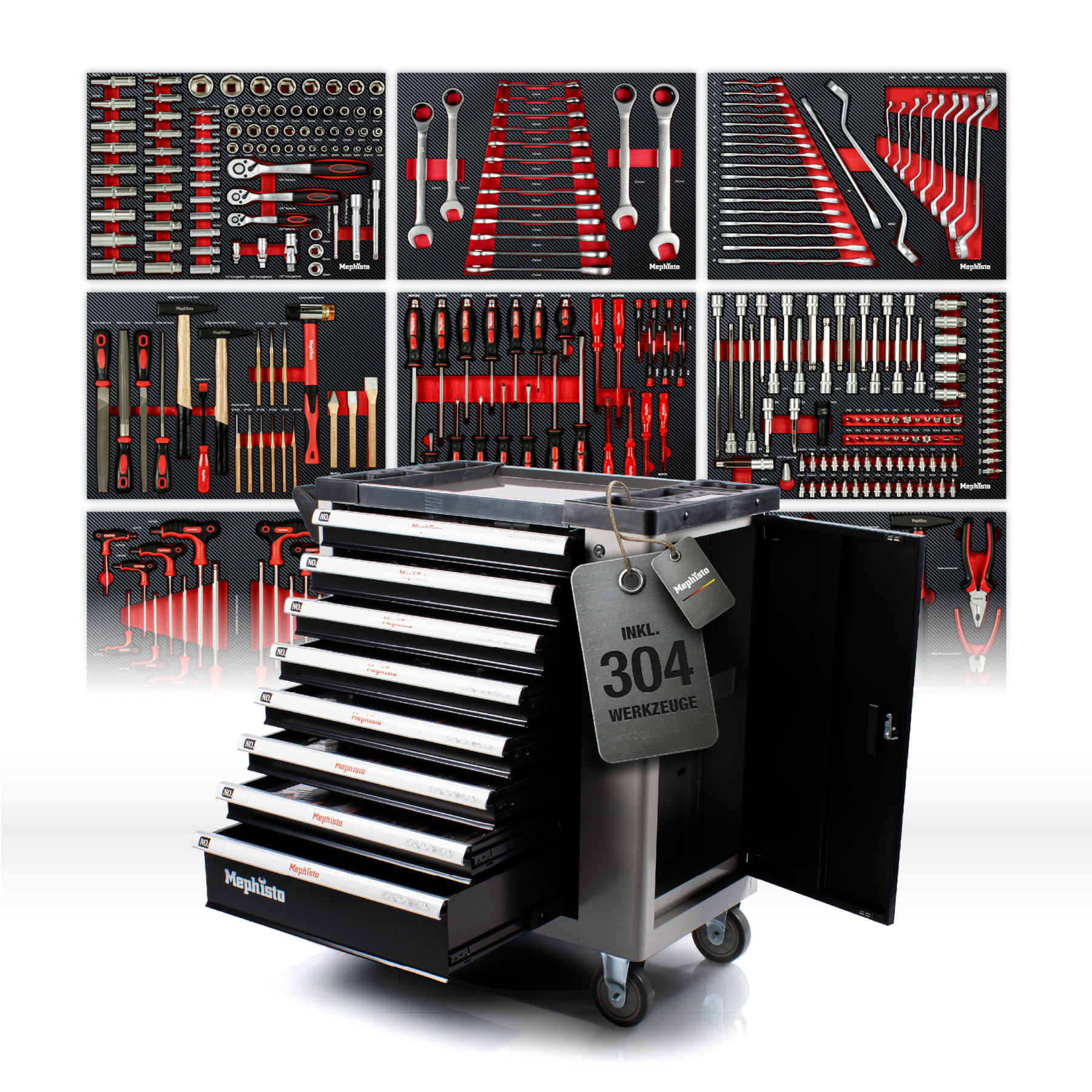 Mephisto Werkzeugwagen XXL Premium mit 8 Schubladen mit Werkzeug gefüllt inkl. Ringschlüssel-Set