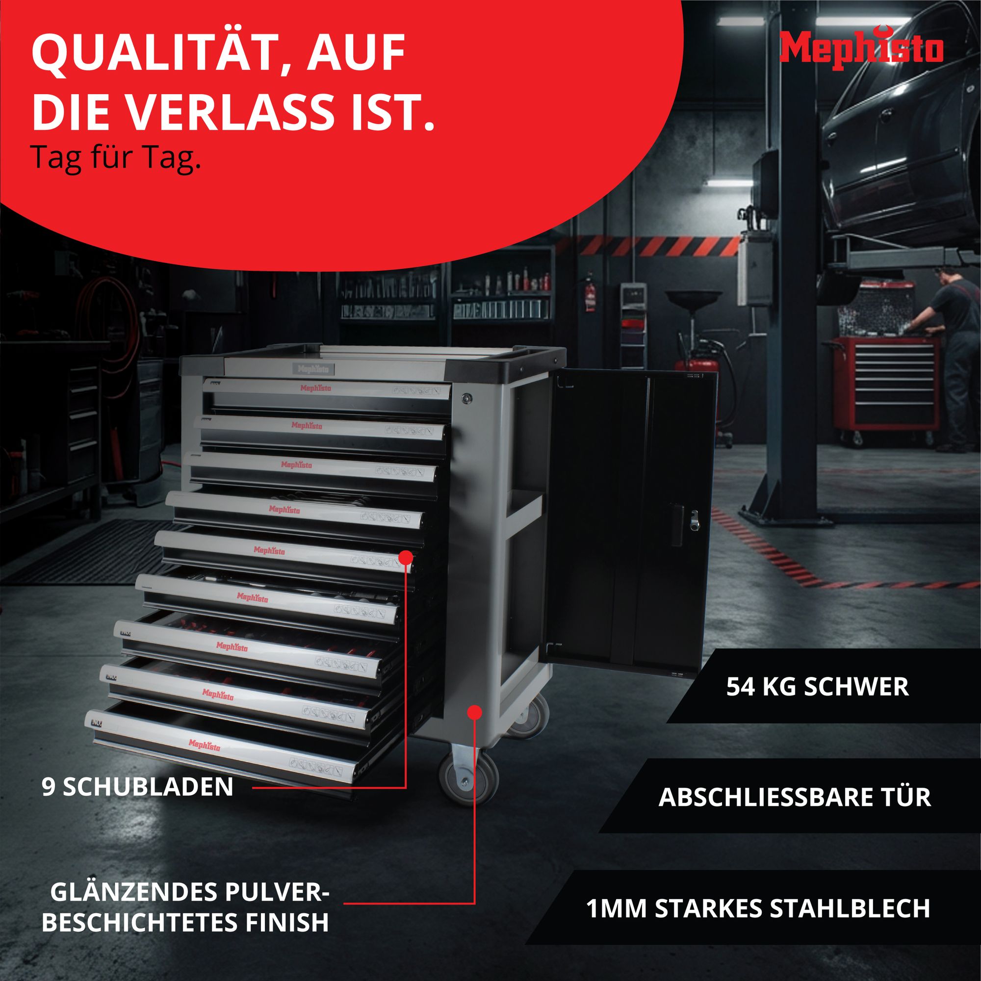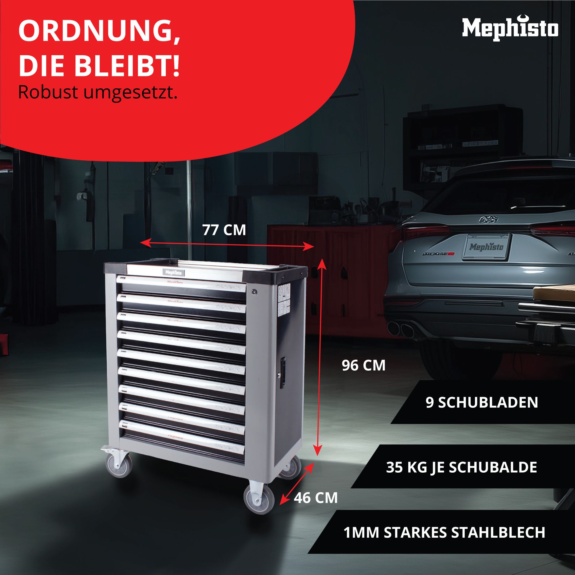 Premium XXL-Werkzeugwagen von Mephisto-Tools 9 Schubfächer (leer)