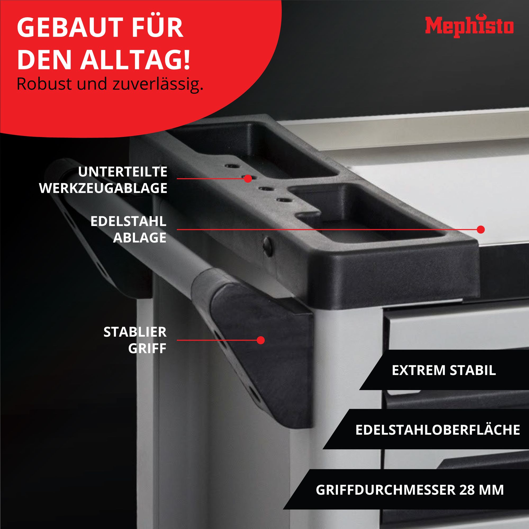 Der Premium XXL-Werkzeugwagen von Mephisto-Tools wurde für den anspruchsvollen Einsatz in Werkstatt, Garage oder Industrie konzipiert. Dank der hochwertigen Materialien und der durchdachten Konstruktion ist er besonders langlebig und belastbar.