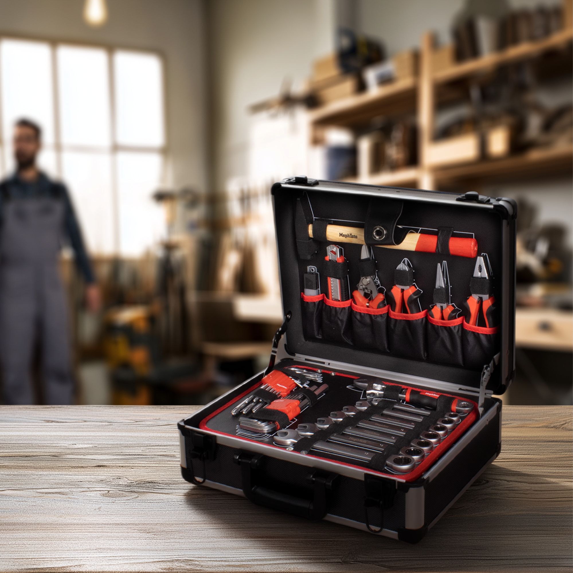Der Mephisto Werkzeugkoffer (104 tlg.) bietet eine kompakte und gut sortierte Komplettausstattung, die alle wichtigen Werkzeuge griffbereit hält und sich ideal für Hobby-Werkstatt, Garage oder mobile Einsätze eignet.