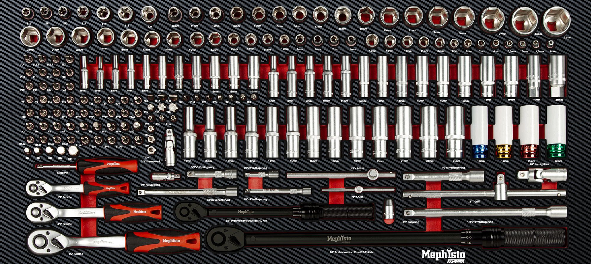 - 17 x 3/8" Nüsse: 6-7-8-9-10-11-12-13-14-15-16-17-18-19-20-21-22 mm