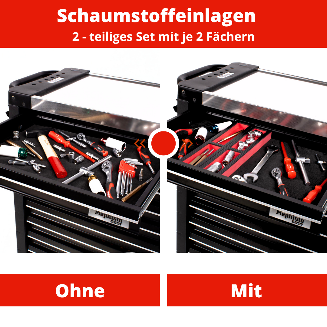 Praktische Schaumstoffeinlage zur Facheinteilung zur übersichtlichen Organisation Ihrer Werkzeuge und Kleinteile. Ideal für Schubladen in Werkstattwagen oder Werkbänken – sorgt für mehr Ordnung, Struktur und Effizienz im Arbeitsalltag.