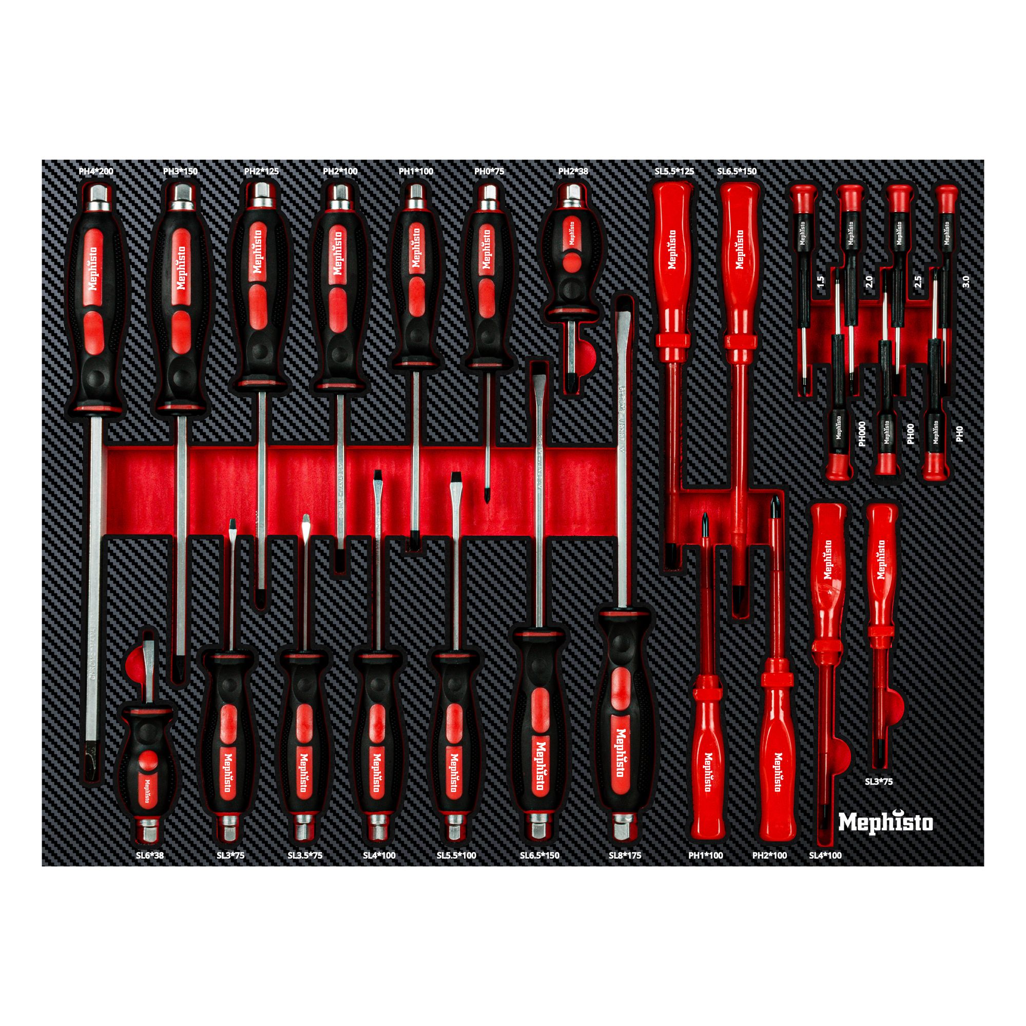 - 7 x Kreuzschlitzschraubendreher: PH2x38 mm / PH0x75 mm / PH1x100 mm / PH2x100 mm / PH2x125 mm / PH3x150 mm / PH4x200 mm