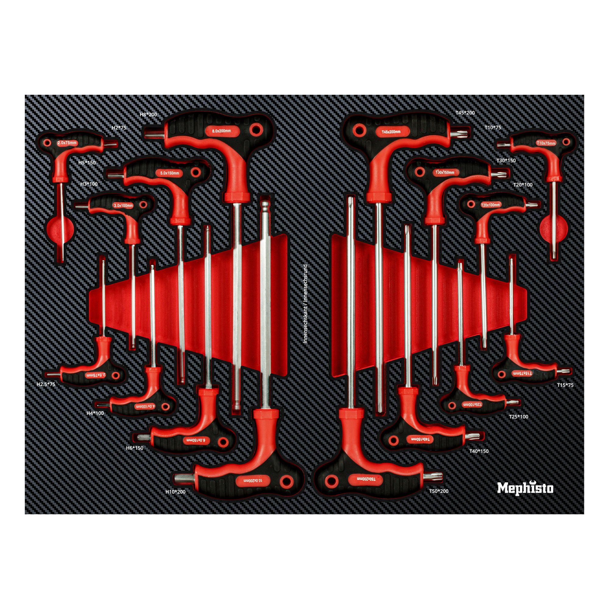 - 16 x Innensechskantschlüssel / Innensechsrund: T10x75 mm, T15x75 mm, T20x100 mm, T25x100 mm, T30x150 mm, T40x150 mm, T45x200 mm, T50x200 mm, H2x75 mm, H2.5x75 mm, H3x100 mm, H4x100 mm, H5x150 mm, H6x150 mm, H8x200 mm, H10x200 mm