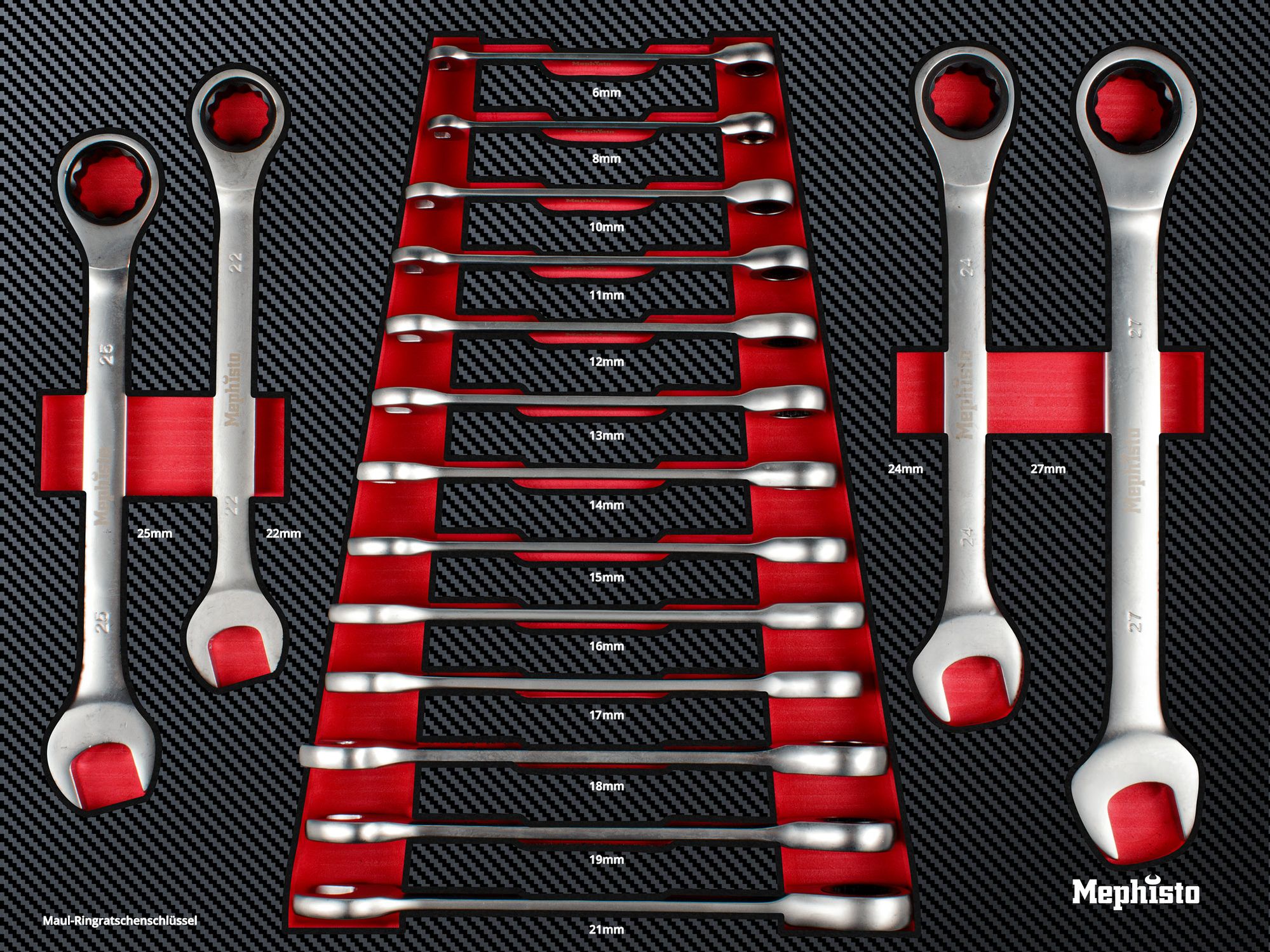 - 17 x Feinverzahnte Ratschenringmaulschlüssel 6 / 8 / 10 / 11 / 12 / 13 / 14 / 15 / 16 / 17 / 18 / 19 / 21 / 22 / 24 / 25 / 27 mm