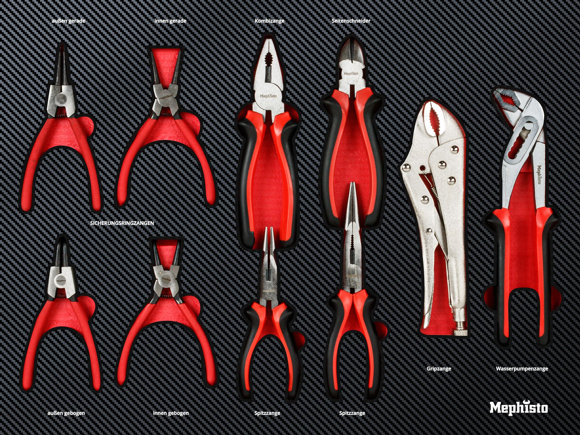 Im Lieferumfang inklusive sind die Werkzeuge. Sie bestehen aus Chrom-Vanadium-Stahl, einem Material, das für seine hohe Belastbarkeit und Langlebigkeit bekannt ist. Die Werkzeugeinlagen aus robustem Schaumstoff im Carbon-Look schützen die Werkzeuge vor Schmutz und Flüssigkeiten.