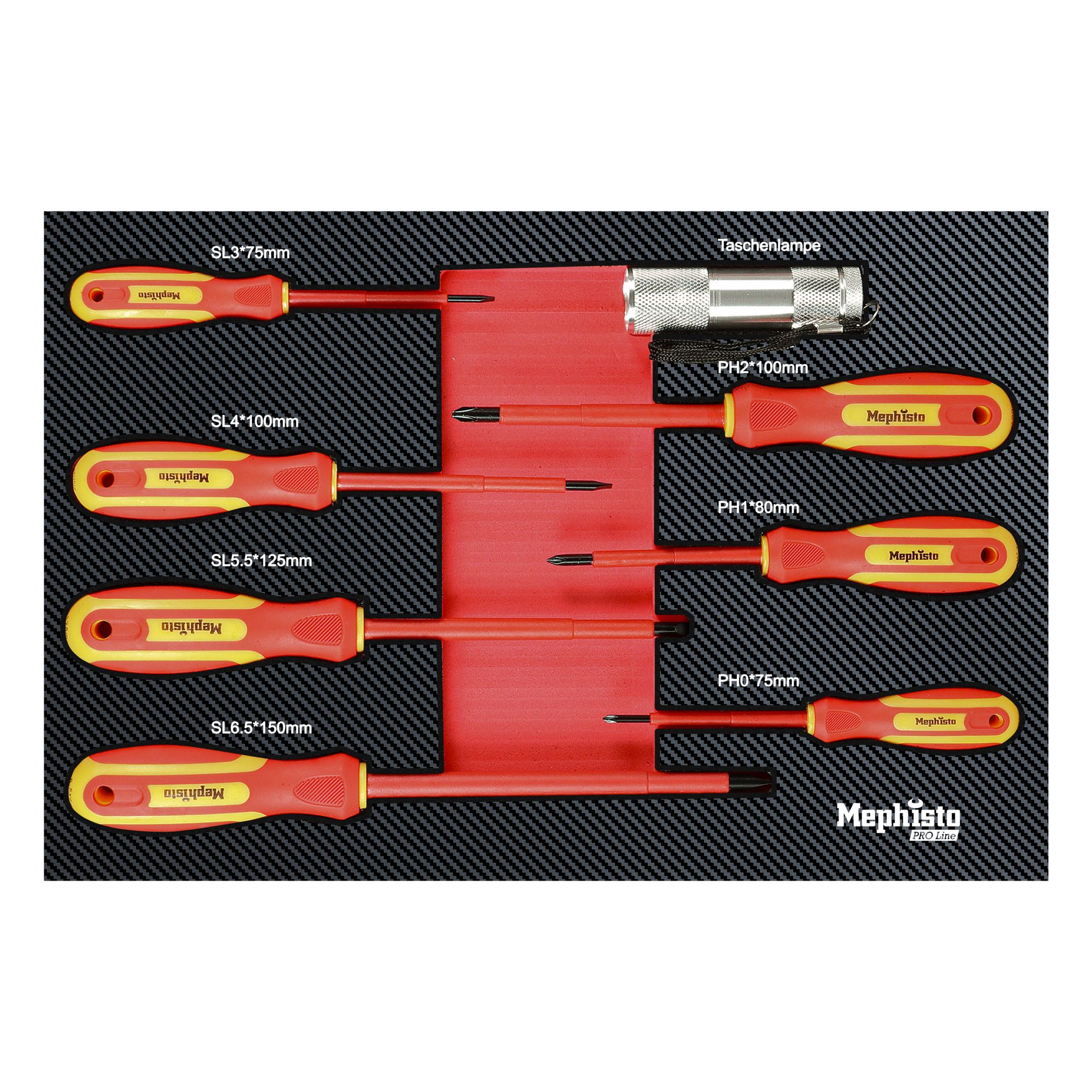 - 7 x VDE Schraubendreher: PH0*75, PH1*80, PH2*100, SL3*75mm, SL4*100mm, SL5.5*125mm, SL6.5*150 mm