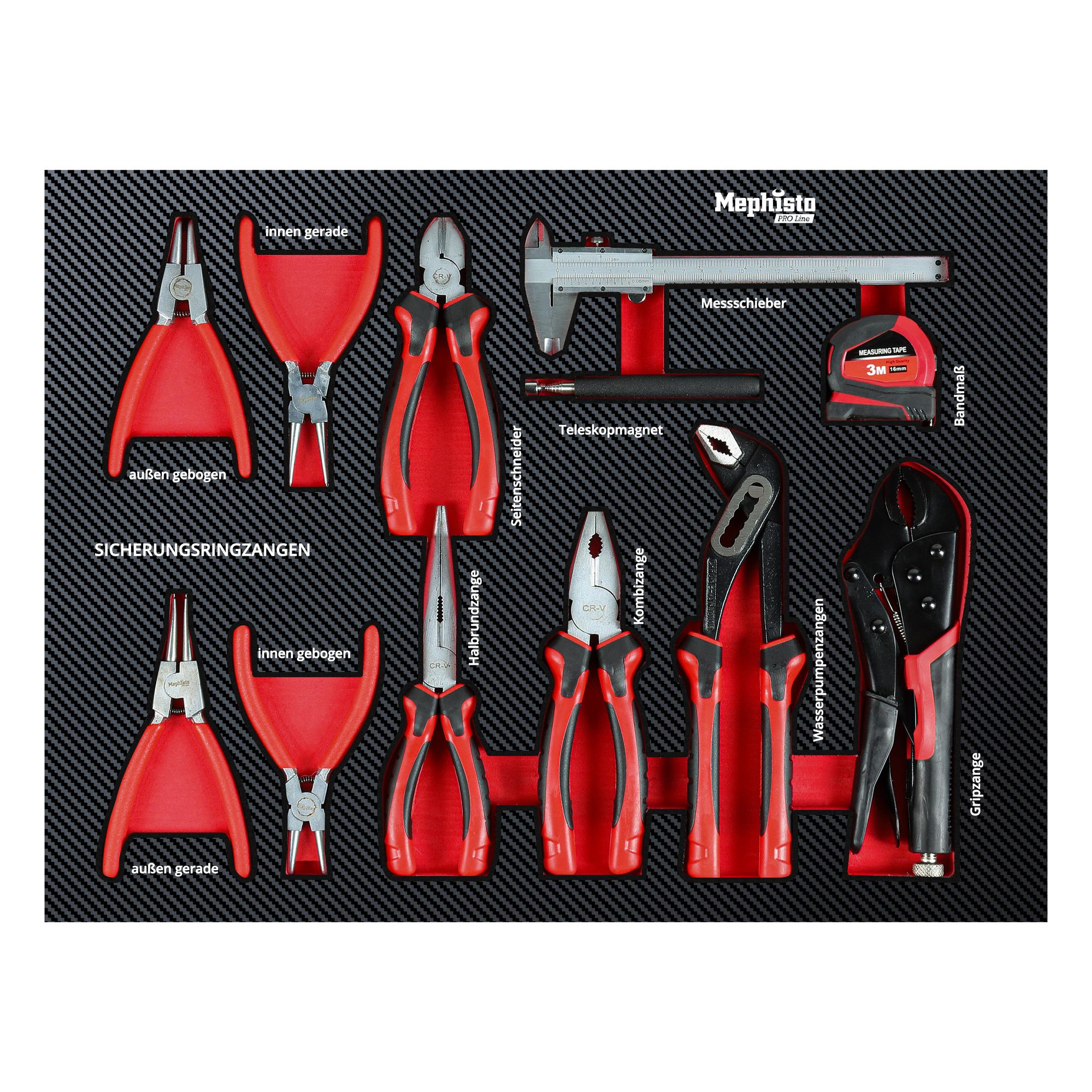 Hochwertige Werkzeugeinlagen aus robustem und flexiblem, verformungsbeständigen Schaumstoffmaterial mit einer flüssigkeitsabweisendem, schmutzabweisendem Beschichtung in Carbon Look
