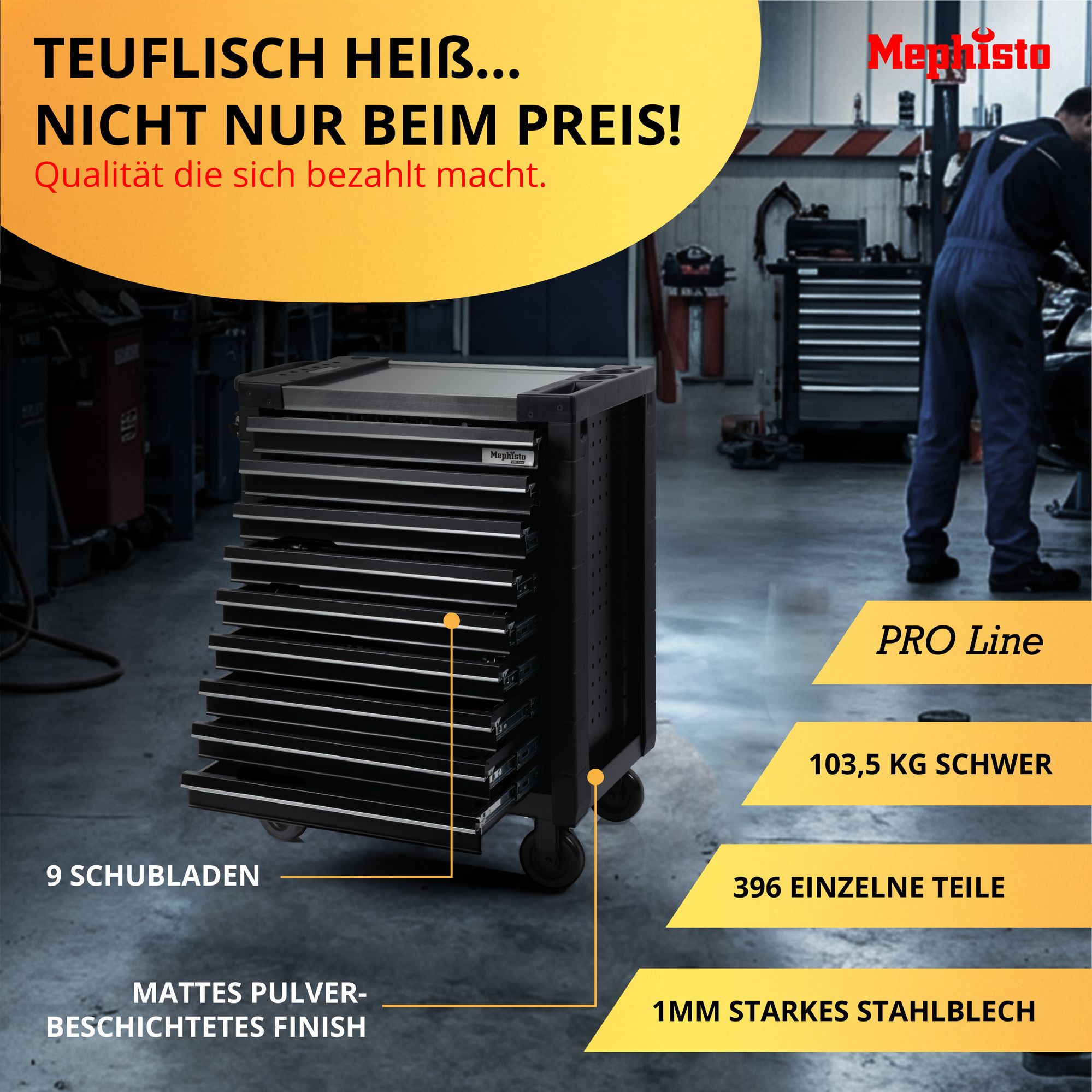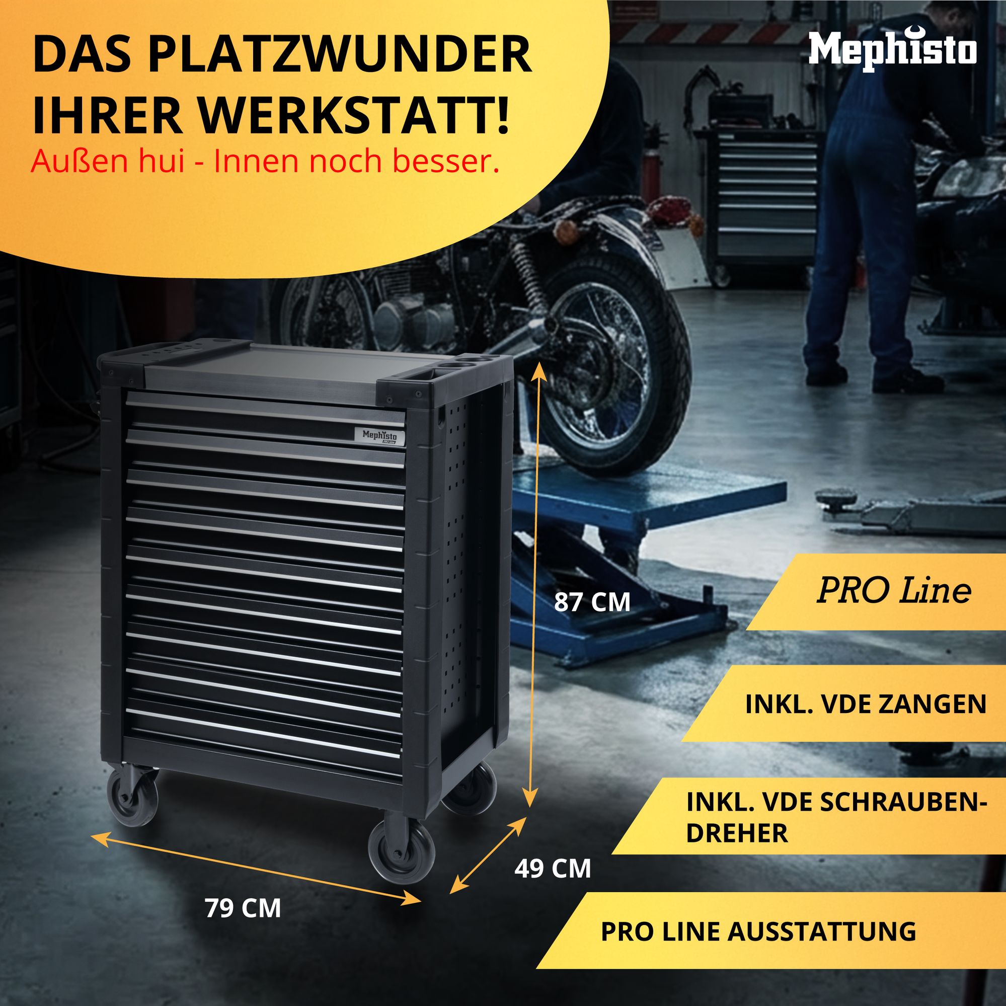 Der Mephisto ProLine Werkzeugwagen "Full Black" ist die perfekte Wahl für Profis und anspruchsvolle Heimwerker, die Wert auf Qualität, Langlebigkeit und Stil legen. Investieren Sie in ein Produkt, das Ihre Arbeit erleichtert und Ihre Werkzeuge optimal schützt.