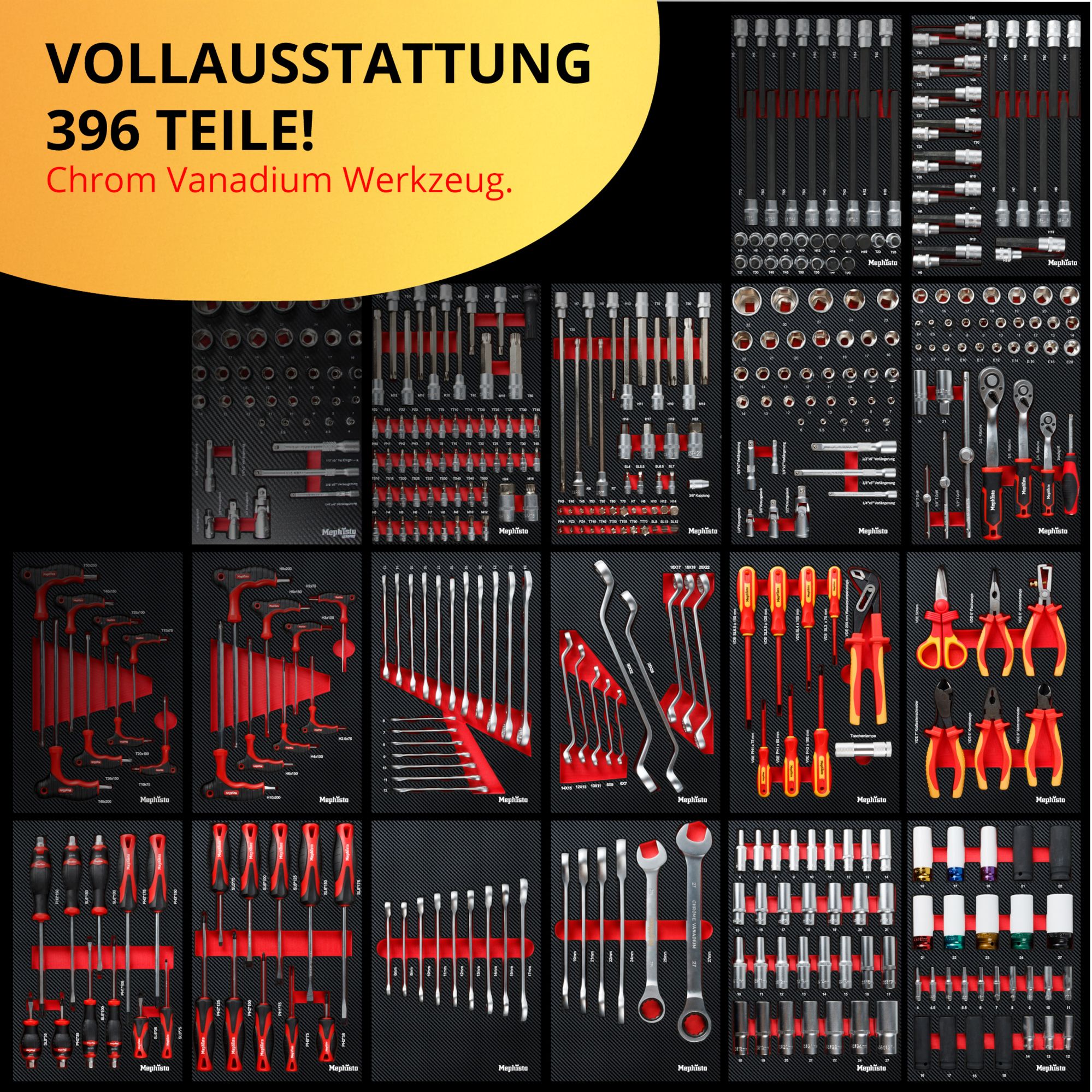 - Chrom Vanadium Stahl: Die im Wagen enthaltenen Werkzeuge bestehen aus bestem Chrom Vanadium Stahl und garantieren Langlebigkeit und Widerstandsfähigkeit.