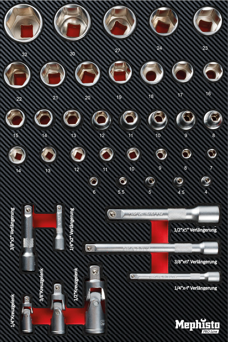 15 x 3/8" Nuss: 6 / 8 / 9 / 10 / 11 / 12 / 13 / 14 / 15 / 16 / 17 / 18 / 19 / 20 / 21 MM