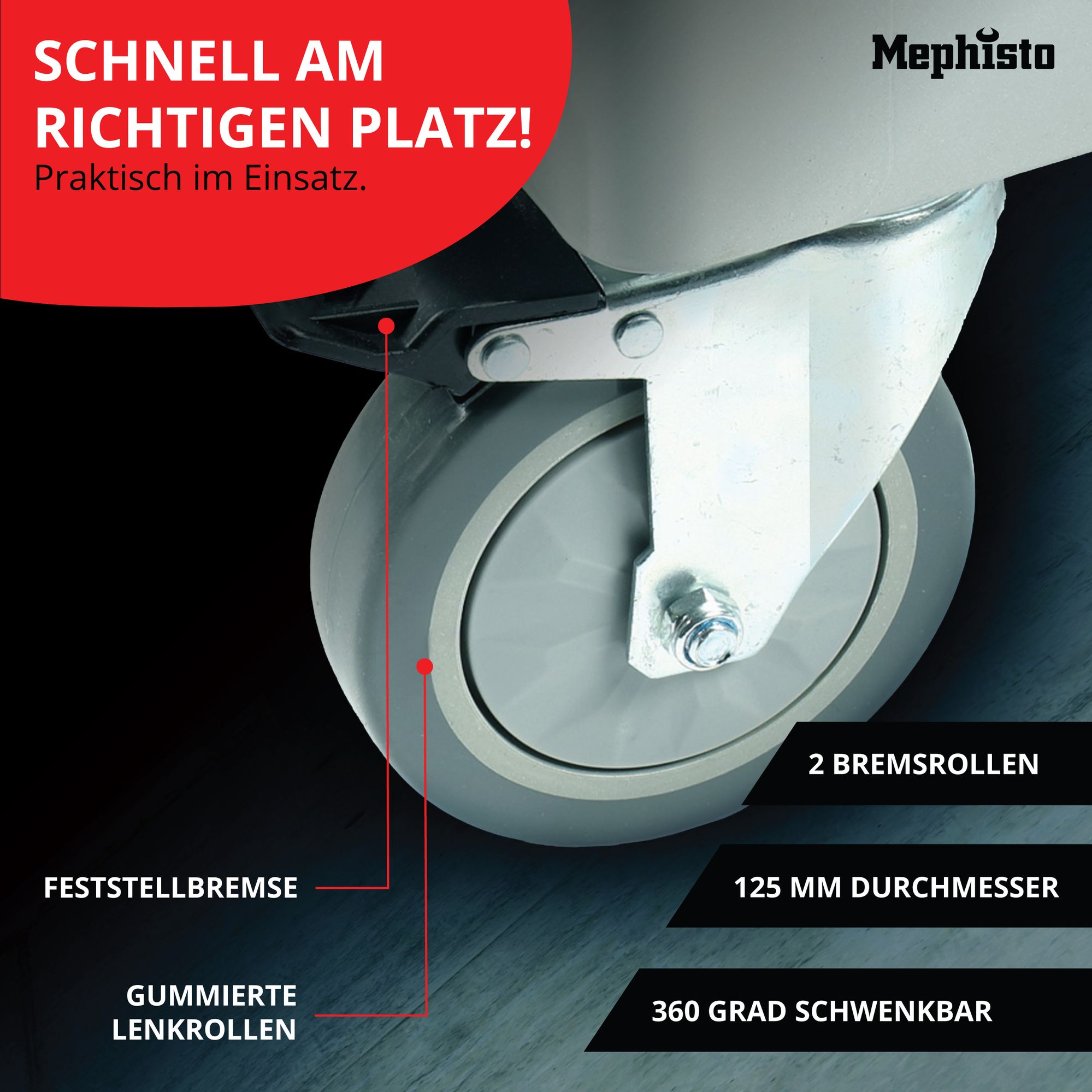 4x kugelgelagerte Rollen mit gummierter Beschichtung, Ø der Rolle 125 mm, (2 Rollen mit Feststellbremse, 360° schwenkbar, somit leicht lenkbar)