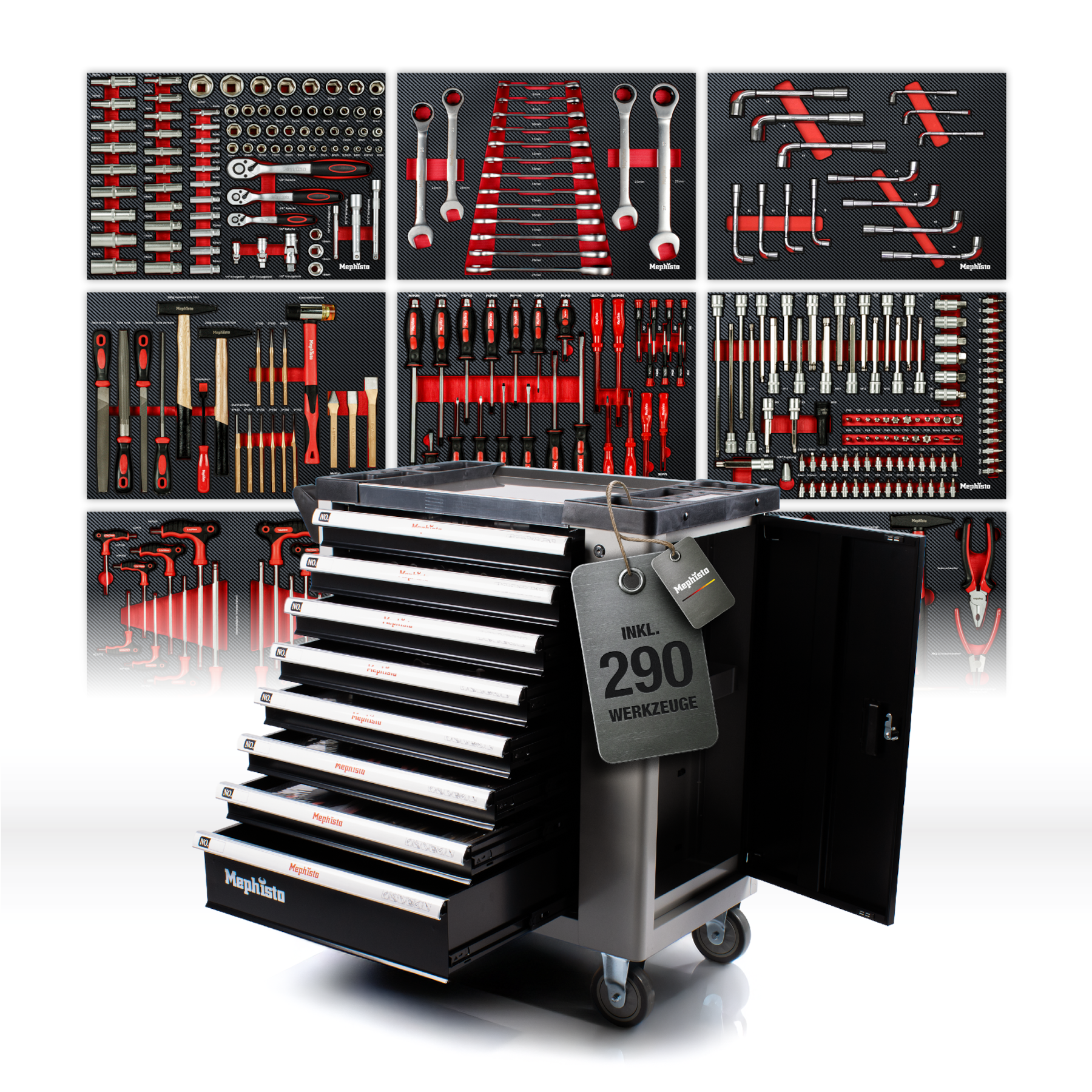 Mephisto Werkzeugwagen XXL Premium mit 8 Schubladen mit Werkzeug bestückt inkl. Pfeifenkopfschlüssel