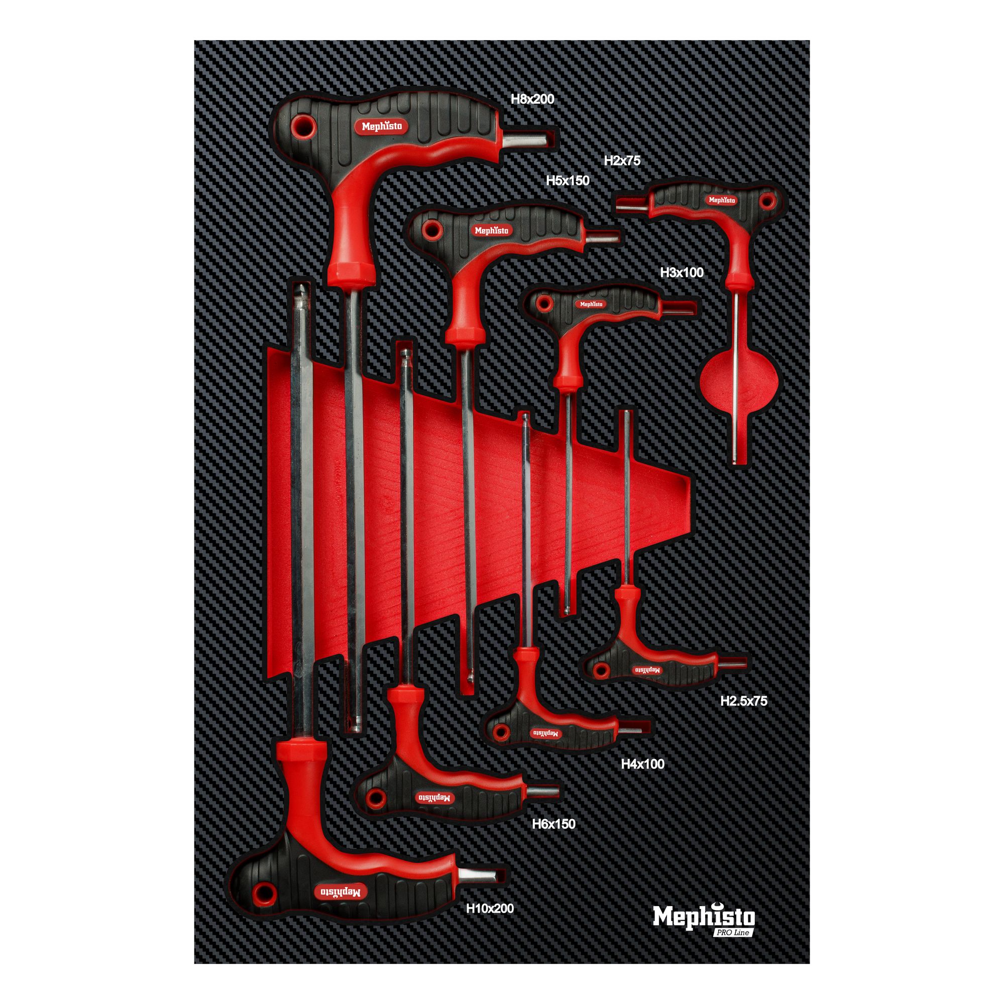 8 x Innensechskantschlüssel: H2x75 mm / H2.5x75 mm / H3x100 mm / H4x100 mm / H5x150 mm / H6x150 mm / H8x200 mm / H10x200 mm